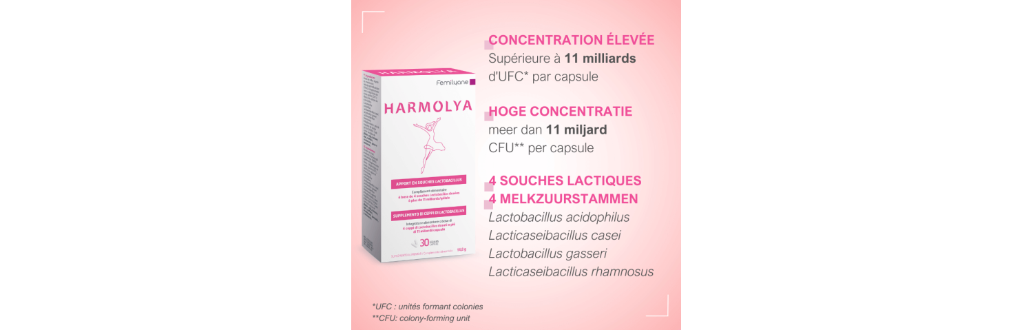 Complément alimentaire contenant 4 souches de bactéries lactiques vivantes, scientifiquement documentées et répondant aux critères d’efficacité suivants : survie et résistance tout au long du tube digestif et adhésion à la muqueuse intestinale.
