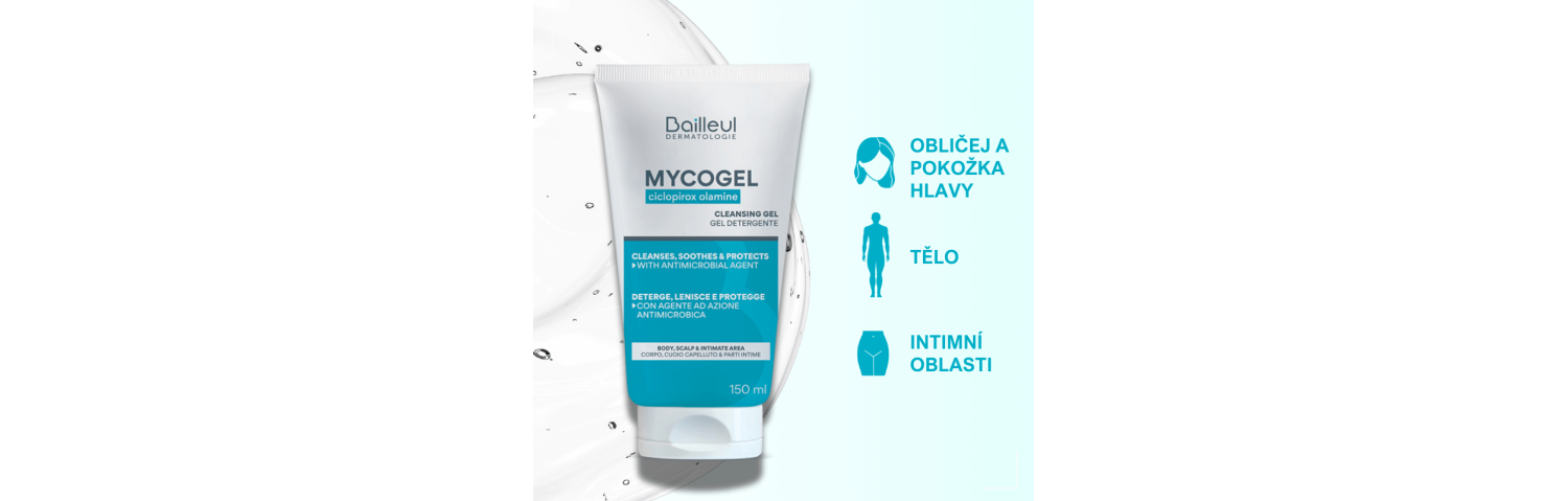 Mycogel je dermatologický přípravek specificky testovaný na citlivou pokožku vlasů, obličeje a těla včetně sliznice vnějších pohlavních orgánů náchylných k mykózám. Jeho nové složení s antimikrobiální látkou „Ciclopirox olamin" zajišťuje spolu s šetrným a účinným čištěním také zklidnění pokožky a vhodně doplňuje ostatní antimykotickou péči.