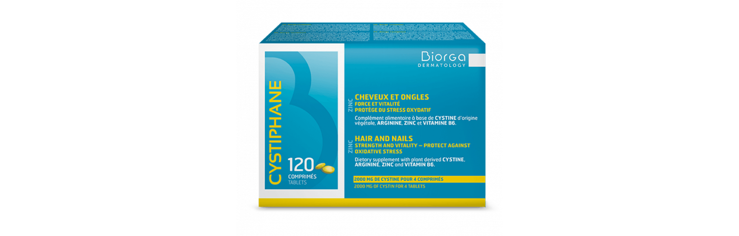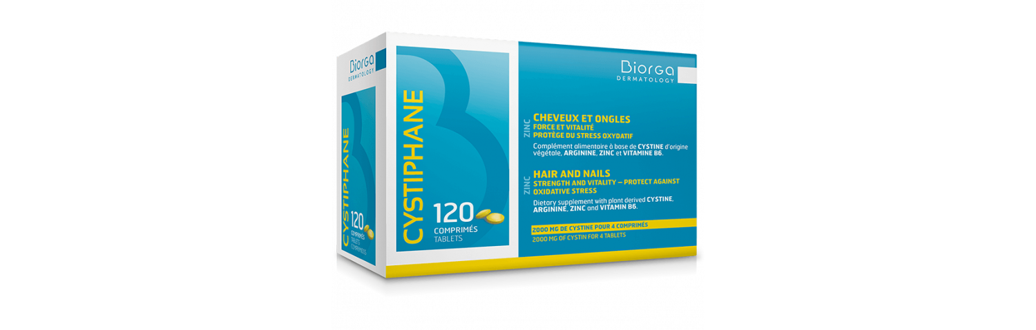 Suplemento alimentar à base de Cistina de origem vegetal, Vitamina B6, Arginina e Zinco.