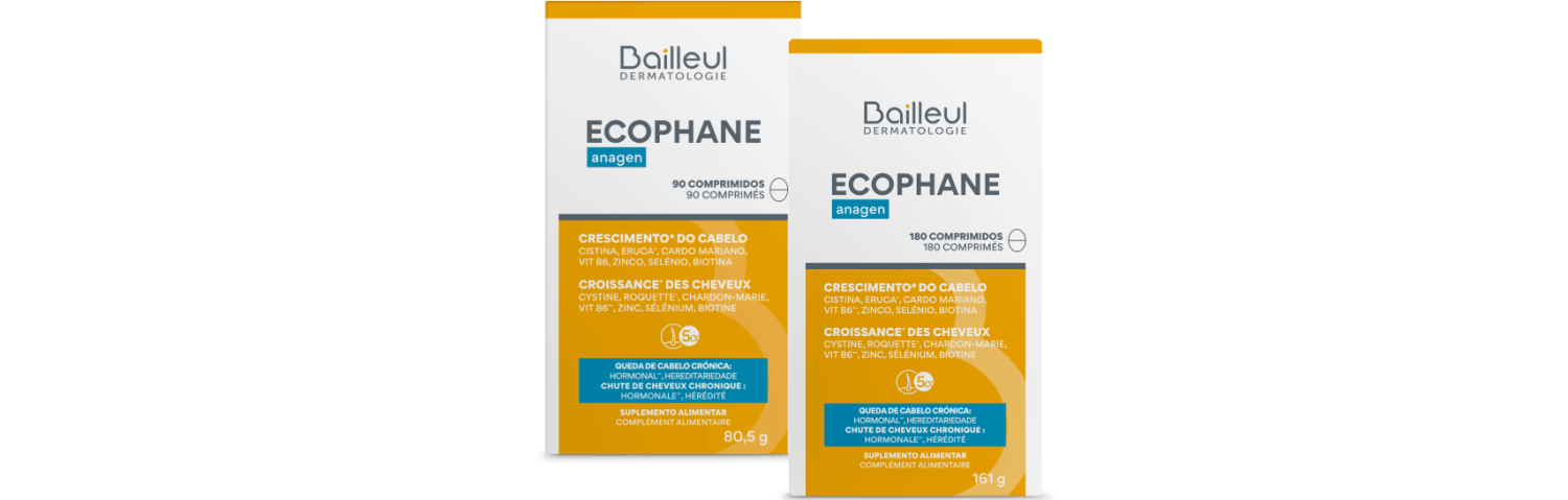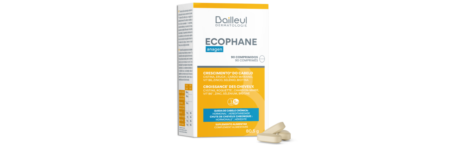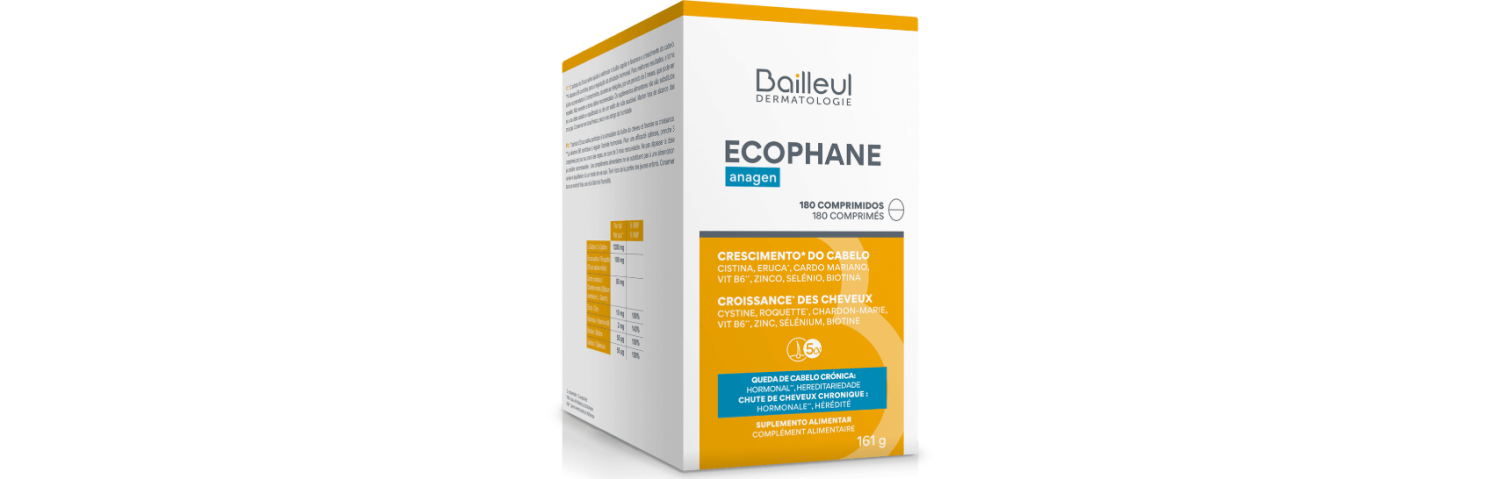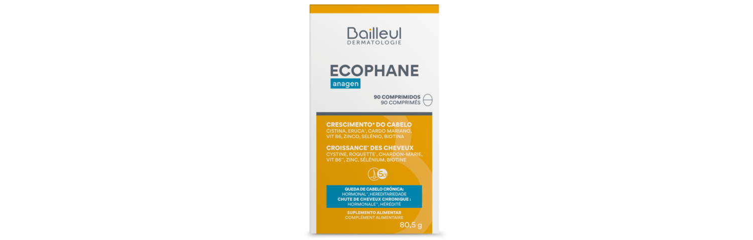 ECOPHANE anagen é um suplemento alimentar com uma fórmula completa para o seu cabelo e adaptada a situações crónicas associadas à hereditariedade ou a causas hormonais.